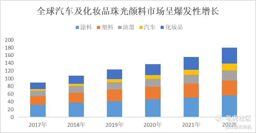 而珠光颜料细分市场中,最具潜力增速最快的当属化妆品级和汽车级的珠光颜料领域。随着消费升级和颜值经济的兴起,相较于传统颜料,珠光颜料的色泽效果、功能性、安全方面都优于前者,下游需求与日俱增。