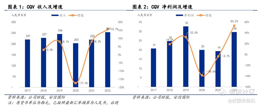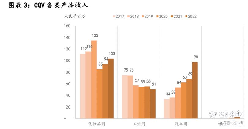 具体来看,其产品主要应用在化妆品、汽车及工业品中。截至2022年,CQV化妆品级、汽车级、工业级的产品分别实现收入1.03亿人民币、9800万人民币、5100万人民币,占总收入比重的41%、39%、20%。目前CQV销售结构不断向高端市场靠拢,工业级的产品比重逐步降低;汽车产品则受益于全球订单的不断增长,销售增长亮眼,占比持续提升。