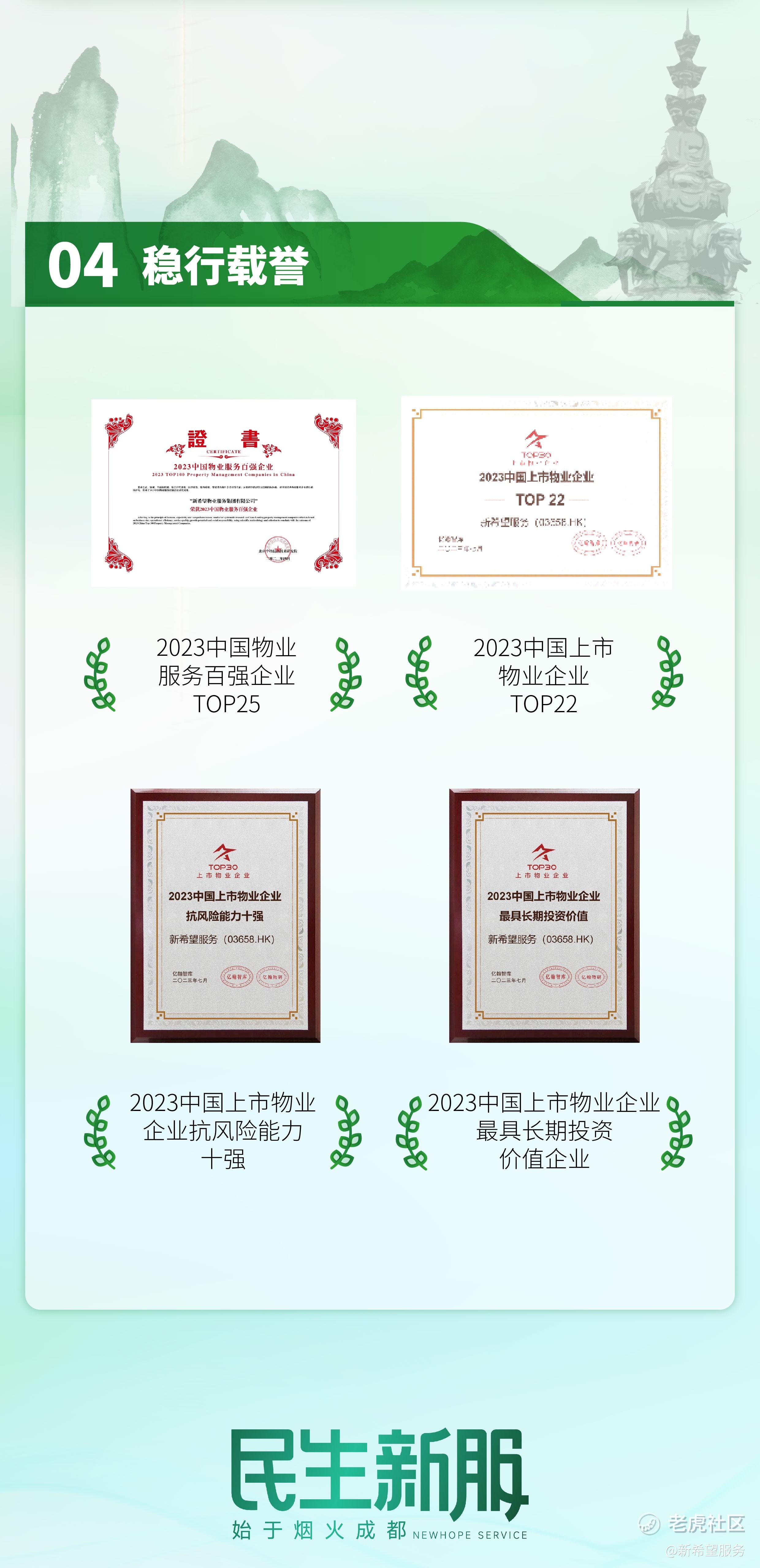民生新服,始于烟火成都,新希望服务(3658.HK)深耕中国都市圈和城市群,是四川本土港股上市物企代表,西部物业服务市场领先企业,因背靠四川第一家世界500强企业新希望集团,具有得天独厚的品牌优势与民生产业供应链优势,重点围绕“资产增值保值”与“生活安心美好”,为不同业态提供物业服务、生活服务及商业运营服务,携手众多优质战略合作伙伴,共同服务城市发展,已成为客户值得托付幸福的民生服务运营商。