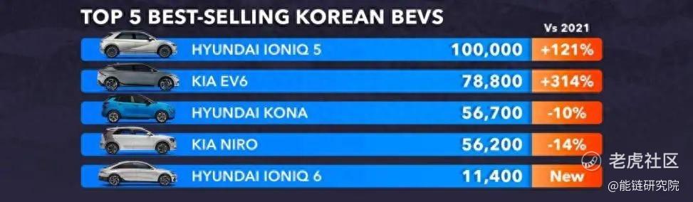 2022年全球市场韩系最畅销电动车前五,分别为现代IONIQ 5、起亚EV6、现代KONA电动版、起亚极睿电动版、现代IONIQ 6 来源:motor1