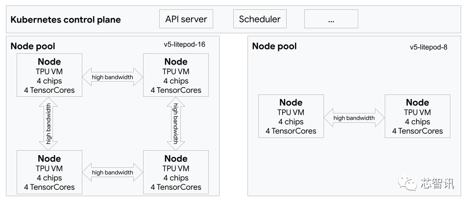 △上图显示了一个包含 1 个 TPU (v5e) 切片(拓扑:4x4)和 1 个 TPU v5litepod-8(v5e) 切片(拓扑:2x4)的GKE 集群