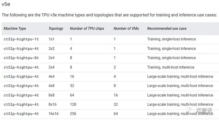 需要指出的是,从第三代TPU v3开始,谷歌就专注于增强可扩展性,以便能够更大规模地并行处理。最新的TPU v5e ,可以通过采用400 TB/s互连来配置多达256个芯片。使得进行更大规模的学习和推理成为可能。谷歌表示,在 256 个芯片配置下,INT8 的算力将达到 100 PetaOps。