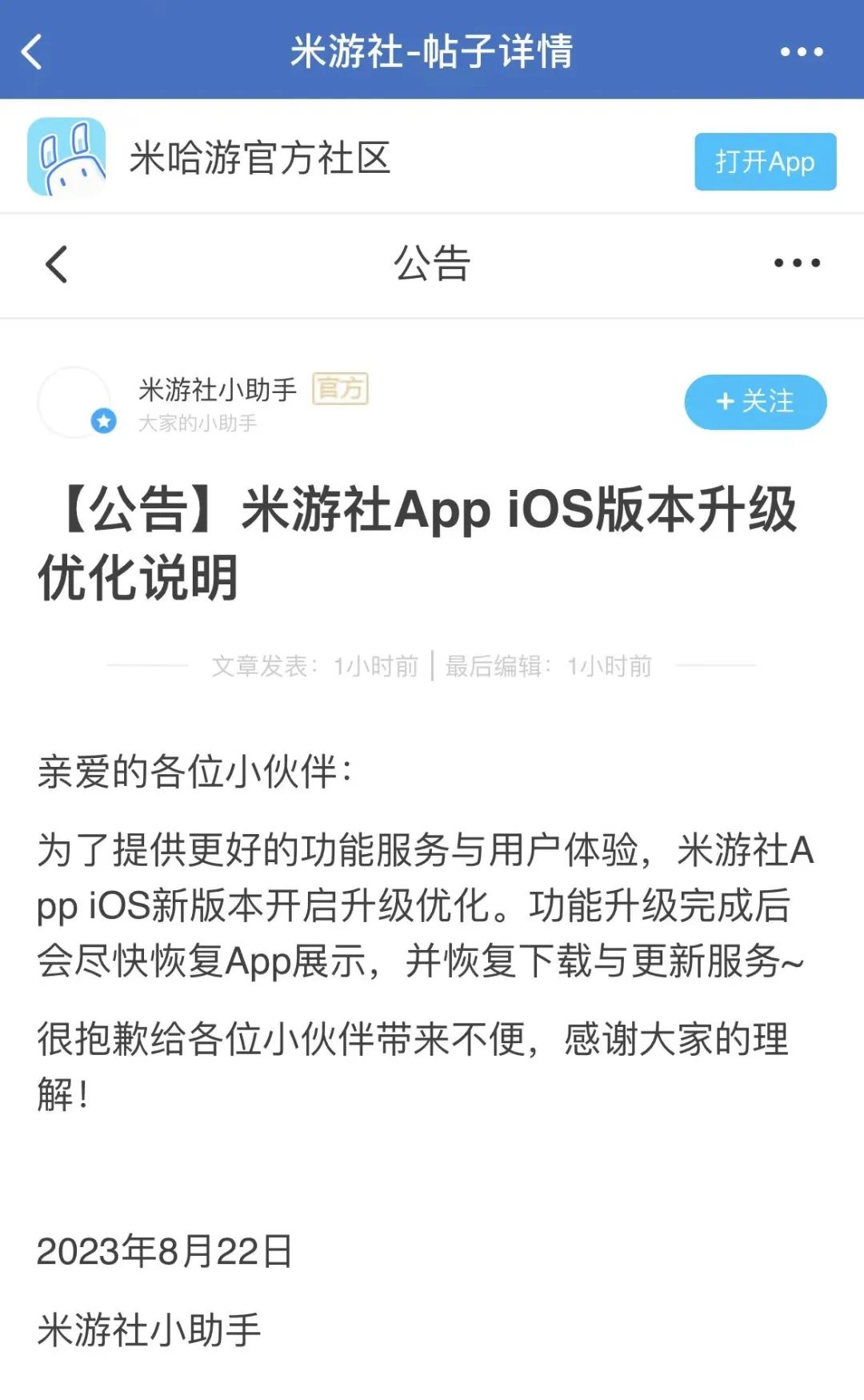 值得注意的是,上周米哈游官方社区米游社宣布iOS版本升级优化,表示为提供更好的功能服务与用户体验,将在功能升级完成后尽快恢复App展示,以及下载和更新服务。
