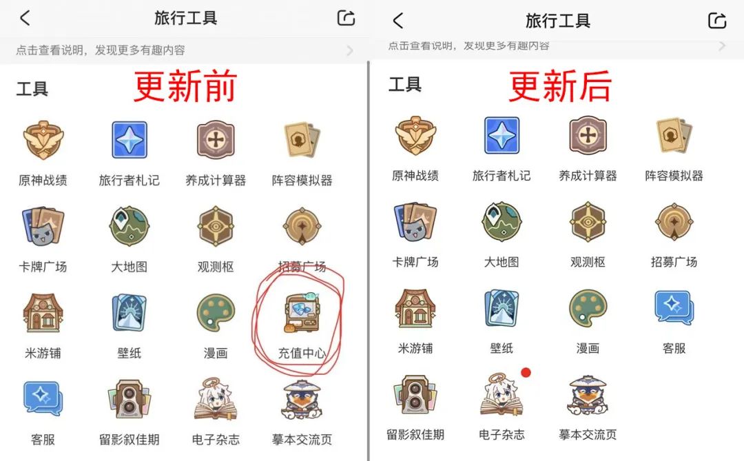 随后玩家发现,米游社iOS版本从国区App Store下架,显示“开发人员已从App Store移除此App”。当米哈游最近几天更新iOS国区版本重新上架后,眼尖的玩家发现,更新后的米游社“旅行工具”菜单下页面移除了之前曾存在的“充值中心”。