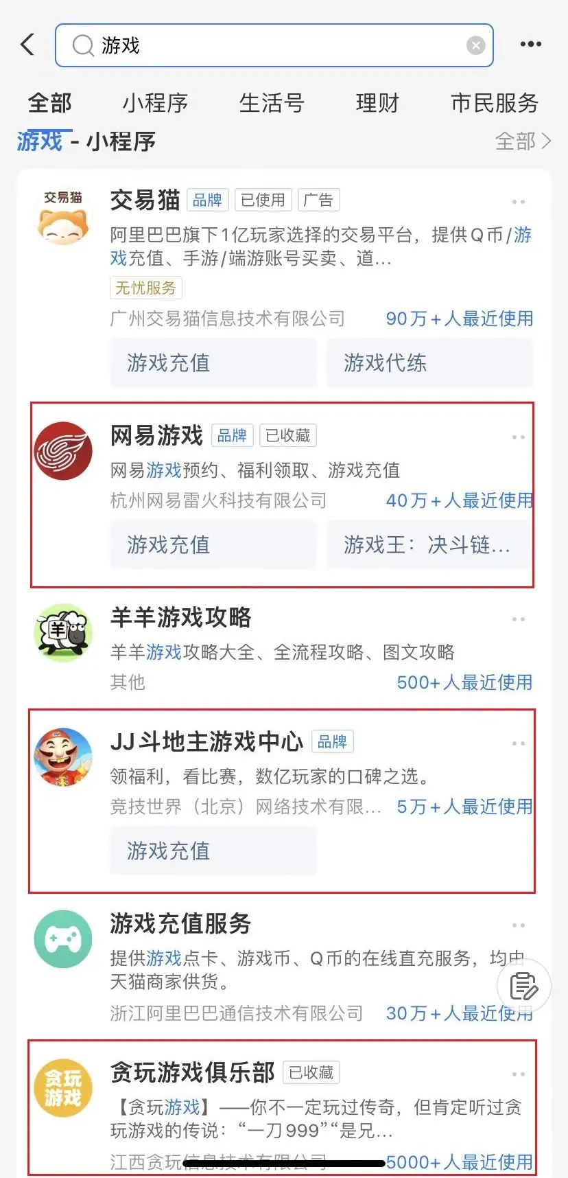 饶有趣的是,Gamelook却没有在支付宝上搜索到阿里旗下的灵犀互娱相关支付小程序。但阿里自身提供了“交易猫”小程序、可进行Q币/多款游戏充值,甚至游戏账号买卖服务。