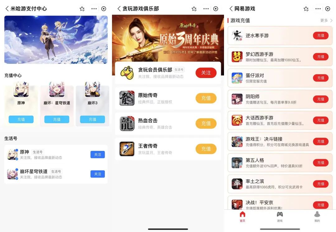 米哈游、网易、贪玩在支付宝的充值小程序