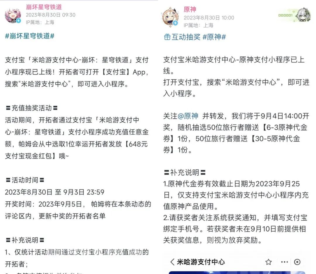8月30日,《原神》、《崩坏:星穹铁道》通过B站官方账号宣布,支付宝小程序“米哈游支付中心”上线,玩家可通过小程序为游戏充值。为推广新上线的充值渠道,两款游戏还分别上线了转发、充值抽奖活动,鼓励玩家通过米哈游支付宝支付中心小程序充值消费。