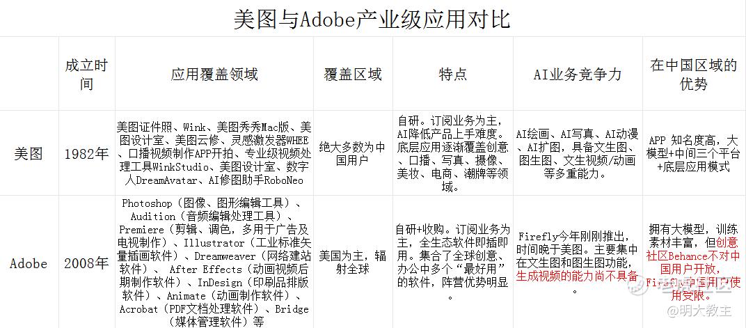 不得不承认,Adobe的应用层比现在的美图要多,但Adobe Firefly却限制性了中国区用户的部分应用,大大影响了产业协同能力。在未来的AIGC时代,国内个人/设计公司大概率使用的是美图的生产力工具,而不是Adobe 的 Firefly!