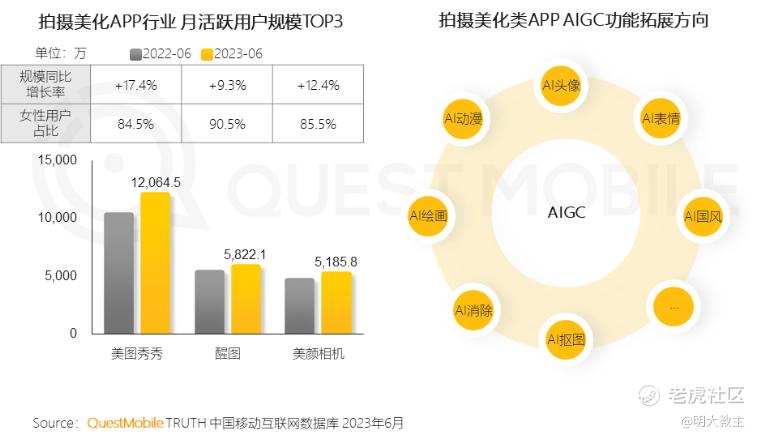 QuestMobile数据显示,6月份,我国移动影像处理市场53%的用户选择了美图秀秀。美图秀秀、美颜相机两款应用6月份MAU占比41%。拍摄美化类AIGC TOP3应用中,美图独占两席。