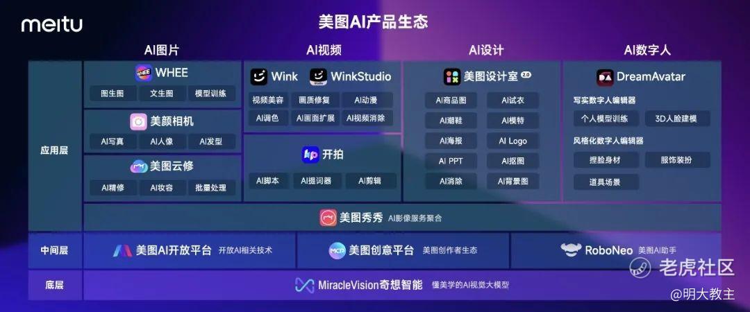6月份,美图在发布大模型及多款产业应用后,已形成奇想智能为底层,美图AI开放平台、美图创意平台、AI助手 RoboNeo为中间层,WHEE、开拍、美图设计室等产品为应用层的架构。是国内极少数集基础层、技术层、应用层为一体的公司,也是少数在AI能力架构上不输Adobe的公司。