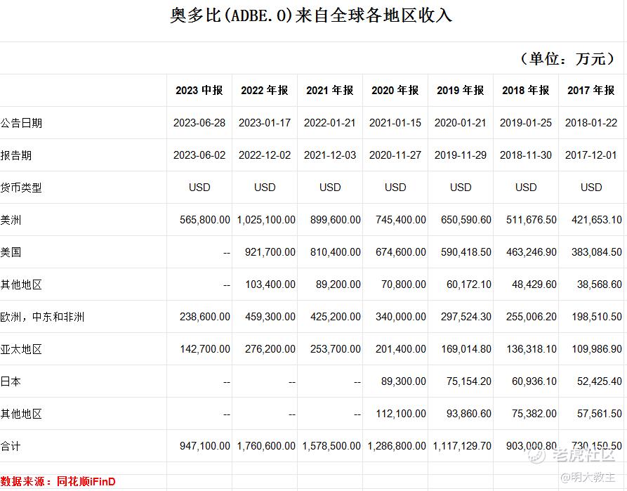 Adobe收入主要来源于美国,但其他国家也贡献了40%以上的收入。