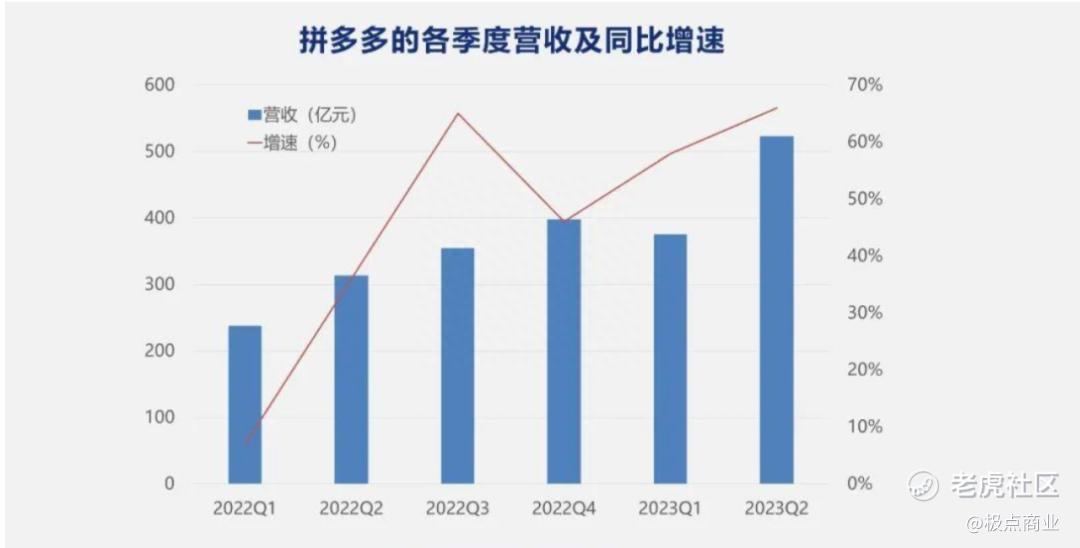 实际上,在拼多多单季营收再创新高前,其已连续5个季度实现营收增长。2022年Q2至2023年Q2,拼多多营收分别为314.39亿、355.04亿、398.2亿、376.37亿和522.81亿。