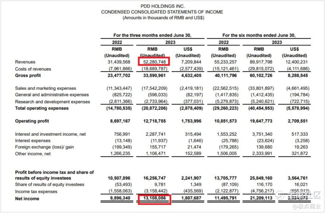 伴随齿轮徐徐转动,8月29日晚,赵佳臻履新150天,交出了向高质量发展转型的首份成绩单:拼多多2023年Q2营收522.8亿元,同比增长66%;净利润131.1亿元,同比增长47%;非美国通用会计准则净利润152.7亿元,同比增长42%。