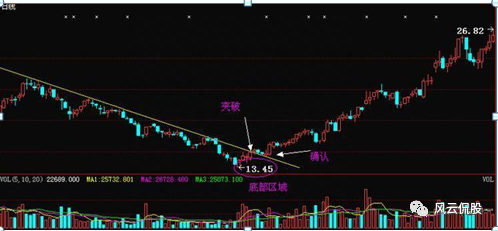 股价到达底部区域后,首先会向上突破,当股价放量上行时,股价会突破下降趋势线,按照趋势来看,每一次向上突破时必然面临重压,即便是当天突破之后,股价都需要时间来确认,所以当看到股价向上放量突破趋势时,即可开始关注,等待回抽确认之后介入把握新的上升趋势机会,和上面的分析类似, 上升趋势一旦形成上涨空间也无可估量!