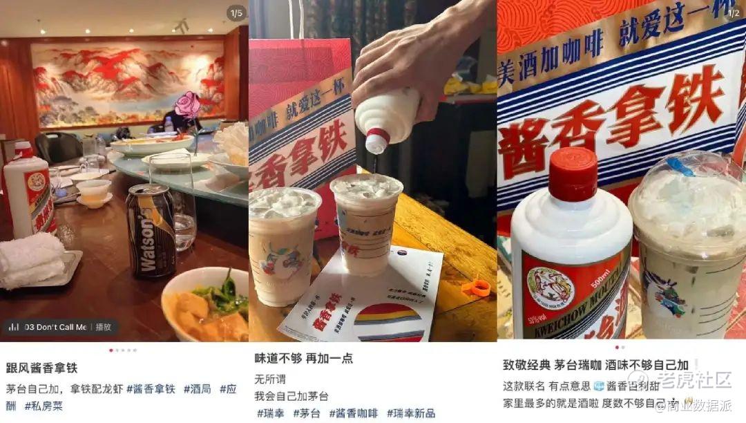 有了茅台加持,瑞幸也高端起来。抢不到茅台,可以抢酱香拿铁。有人阴阳怪气道,“咱们瑞不限购么”,也有人秀出了瑞幸配真茅台的图,“有点淡,我自己加点”。这些爱茅台的中年人,除了长期被年轻人们吐槽酒桌文化以外,终于找到了不招人讨厌的炫耀方式。