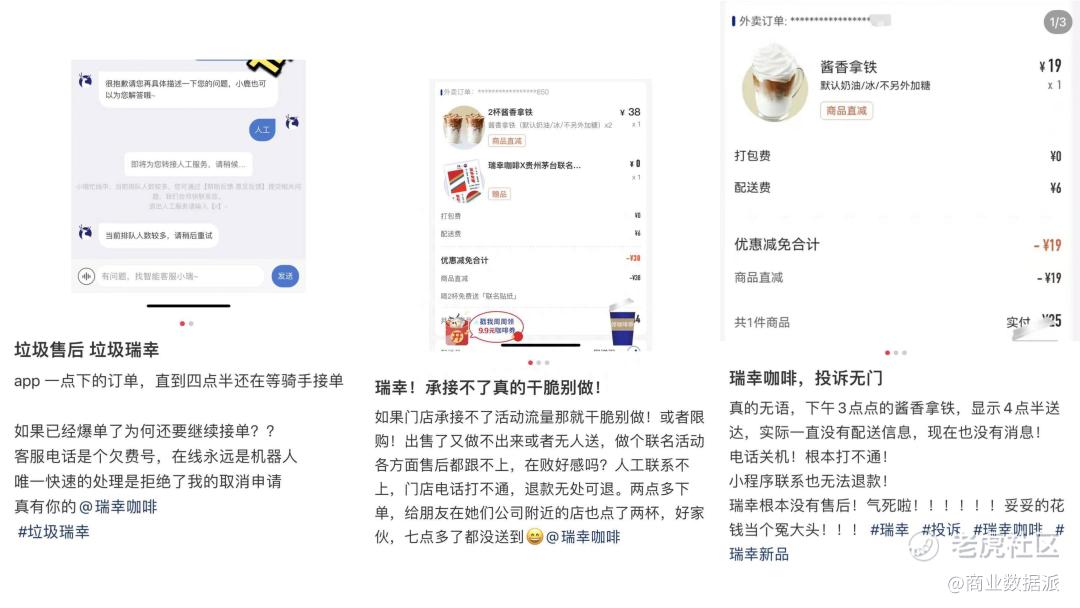 不过,短时间内的大量爆单,热度过高也对瑞幸造成了反噬。不少消费者向商业数据派吐槽,“等了3小时还没送到,到店里没法自提,联系客服退不了单。”