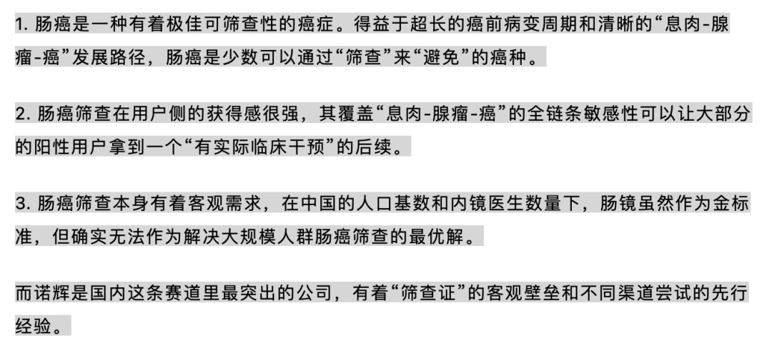 前两篇文章,我的观点一直是这并未影响我对于肠癌筛查赛道和诺辉的长期判断,这份报告显然也没办法让我改变观点: