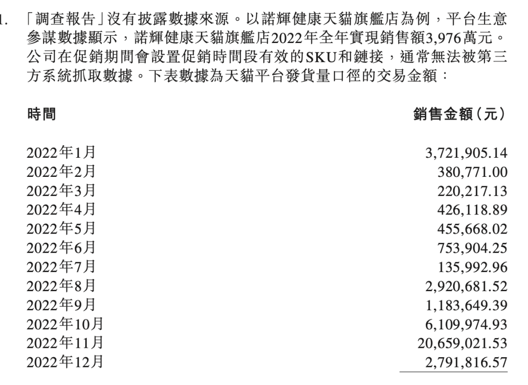 但是大哥,咱用数据真的可以严谨点。爬虫去爬电商平台的数据确实会因为 SKU 链接的阶段性变动而失准,但诺辉其实在半年报中提供了天猫平台发货量口径的交易金额,这部分是得不出这个结论么?
