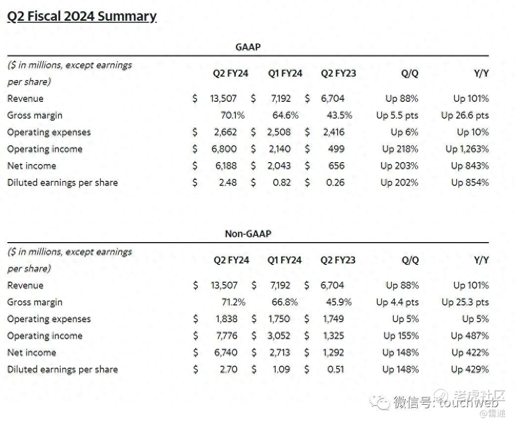 英伟达2023年第二季度净利为61.88亿美元,较上年同期的6.56亿美元增长843%,较上一季度的20.43亿美元增长203%。