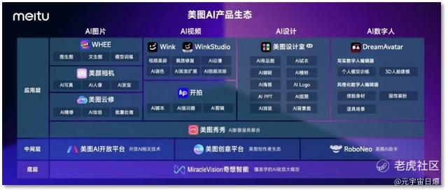 这些投入研发换来的结果,是美图的视觉大模型 MiracleVision以及一系列面向C端的AIGC工具,形成由底层、中间层和应用层构建的AI产品生态。