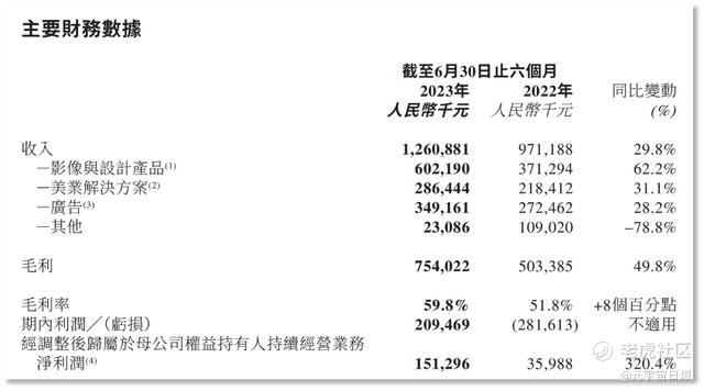 股价回升得益于美图公布的惊人业绩。据2023年度中期业绩报告,该公司实现总收入12.61亿元,同比增长29.8%。更亮眼是利润,据报告,该公司归母净利润1.51亿元,同比增长320.4%。