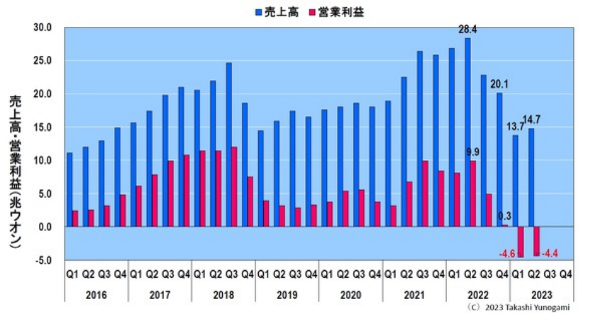 然而,在 2023 年第一季度,它最终将降至 1.4 万亿韩元的赤字。如果您想知道业务绩效会恶化到什么程度,那么在接下来的一个季度中,营业利润持平,亏损了6.2万亿韩元,销售额开始小幅上升。
