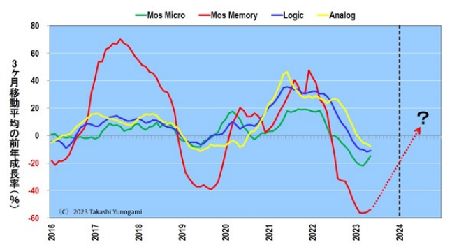 上一年按类型划分的半导体出货量增长率(3个月移动平均值)(2016年至2023年6月扩展)来源:WSTS