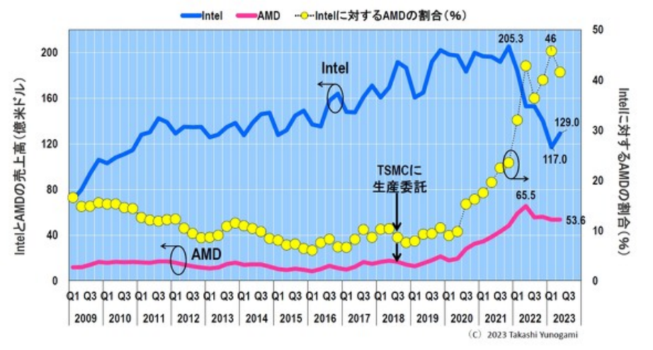 另一方面,直到2017年左右,AMD的销售额还不到英特尔的10%。然而,从2018年第三季度开始将生产外包给台积电后,销售额逐渐上升,到2022年第二季度达到65.5亿美元。