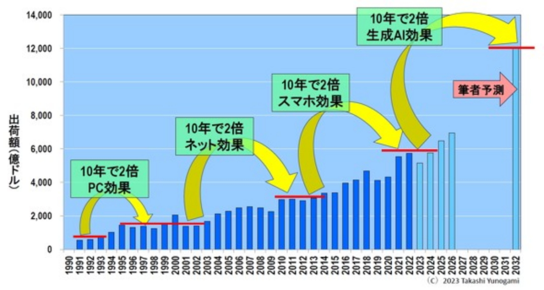 全球半导体市场在 1990 年代约为 750 亿美元,由于个人电脑的普及,十年后的 2000 年代翻了一番,达到 1500 亿美元。其次,随着个人电脑的普及,互联网用户激增,互联网用户数量在2010年代增长到3000亿美元,是2000年代的两倍。接下来,由于智能手机的普及,2020年代增长到近6000亿美元,是2010年代的两倍。