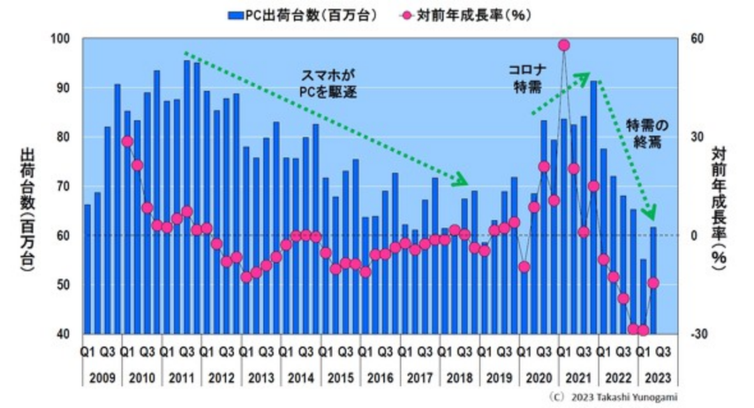 随着2020年新冠疫情的蔓延,PC出货量迅速增加,在2021年第四季度达到9100万台出货量的峰值。这是因为由于疫情期间远程工作、在线学习和在线购物的爆炸性蔓延,对 PC 的需求迅速增加。然而,这种疫情引起的特殊需求在 2022 年迅速结束,出货量大幅下降。