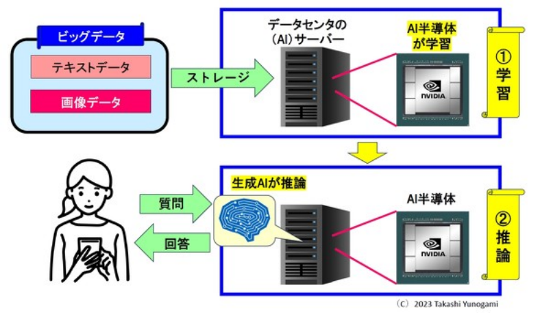 接下来,当用户写下问题时,运行在AI服务器上的生成的AI会做出推理并给出答案。那时,在AI服务器上进行推理的仍然是NVIDIA的GPU等AI半导体。