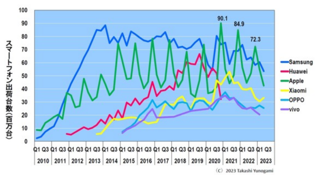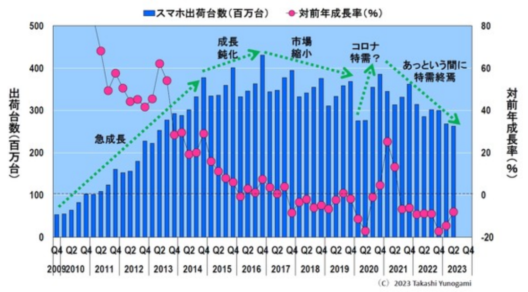 图 10显示了每个季度智能手机的出货量。自2010年以来,智能手机出货量快速增长。然而,2014 年之后增长放缓,并于 2016 年第四季度达到 430 万台的峰值。此后出货数量逐渐减少,虽然2020年因特殊需求略有恢复,但这些需求很快结束,出货数量迅速减少。
