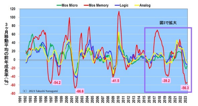 如果我们放大2016年以来的增长率,我们可以看到Mos Micro和Mos Memory在2023年4月触底,而Logic和Analog的增长率则有所放缓(图3)。因此,可以说各种半导体正在复苏的道路上。上一年三个月移动平均增长率使用以下公式计算。
