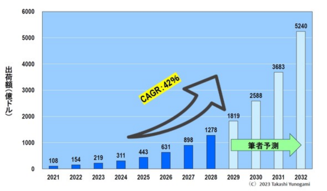 根据世界半导体市场统计(WSTS),2022年全球半导体市场规模将达到5734亿美元。因此,上述预测的2032年AI半导体市场规模将与2022年全球半导体市场规模相同。
