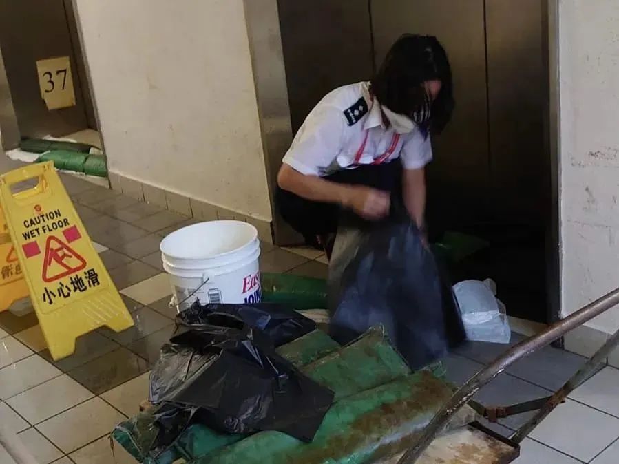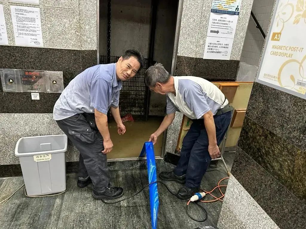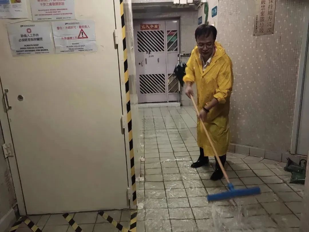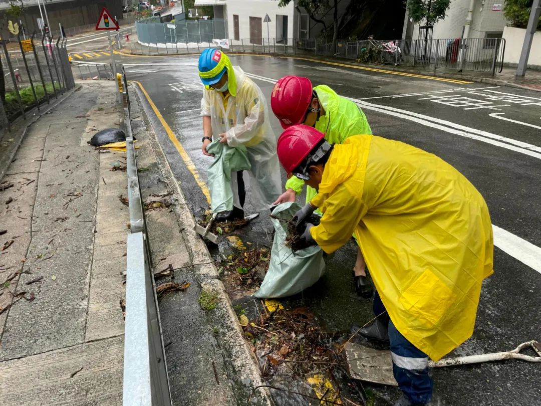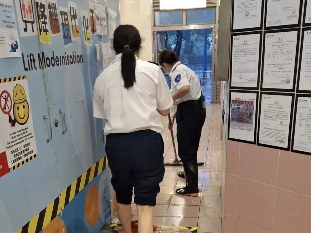 无论是在特殊项目、设施管理项目,还是在管公共屋邨美林邨、苏屋邨、石荫邨、葵芳邨,到处都可以见到中海人忙碌的身影。他们齐心合力堆砌沙包挡板、通宵不间断清理积水、清除排水口杂物、移除室外易坠物体。