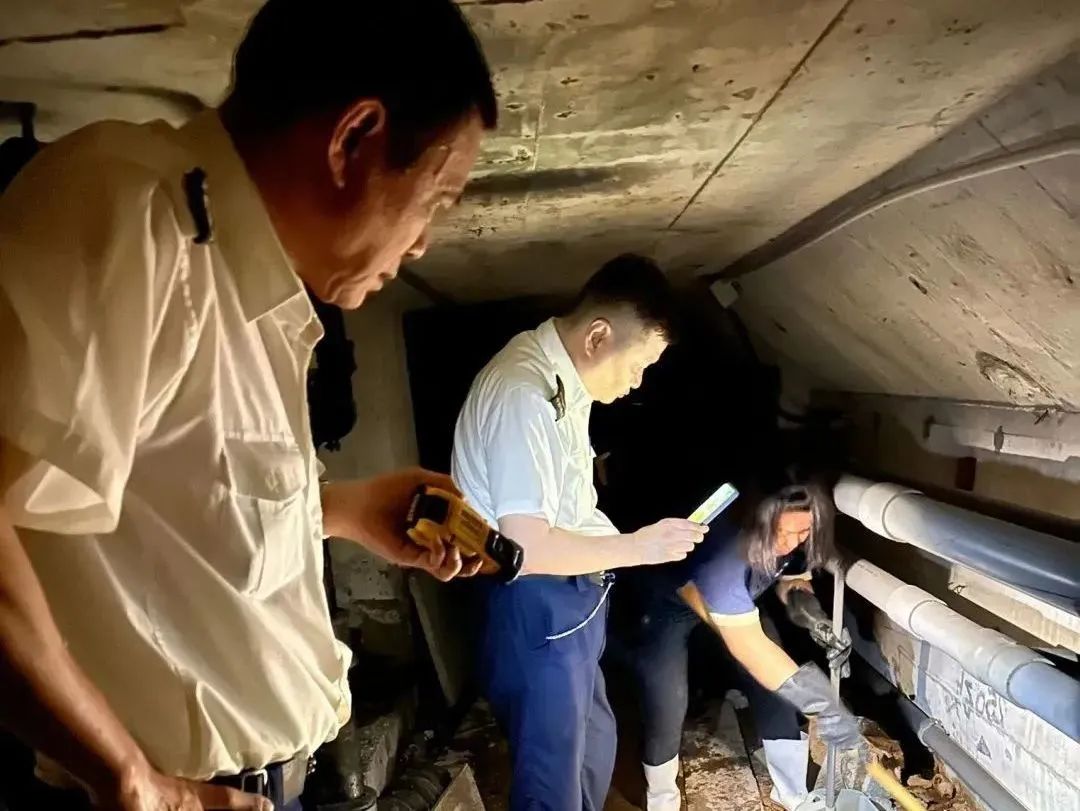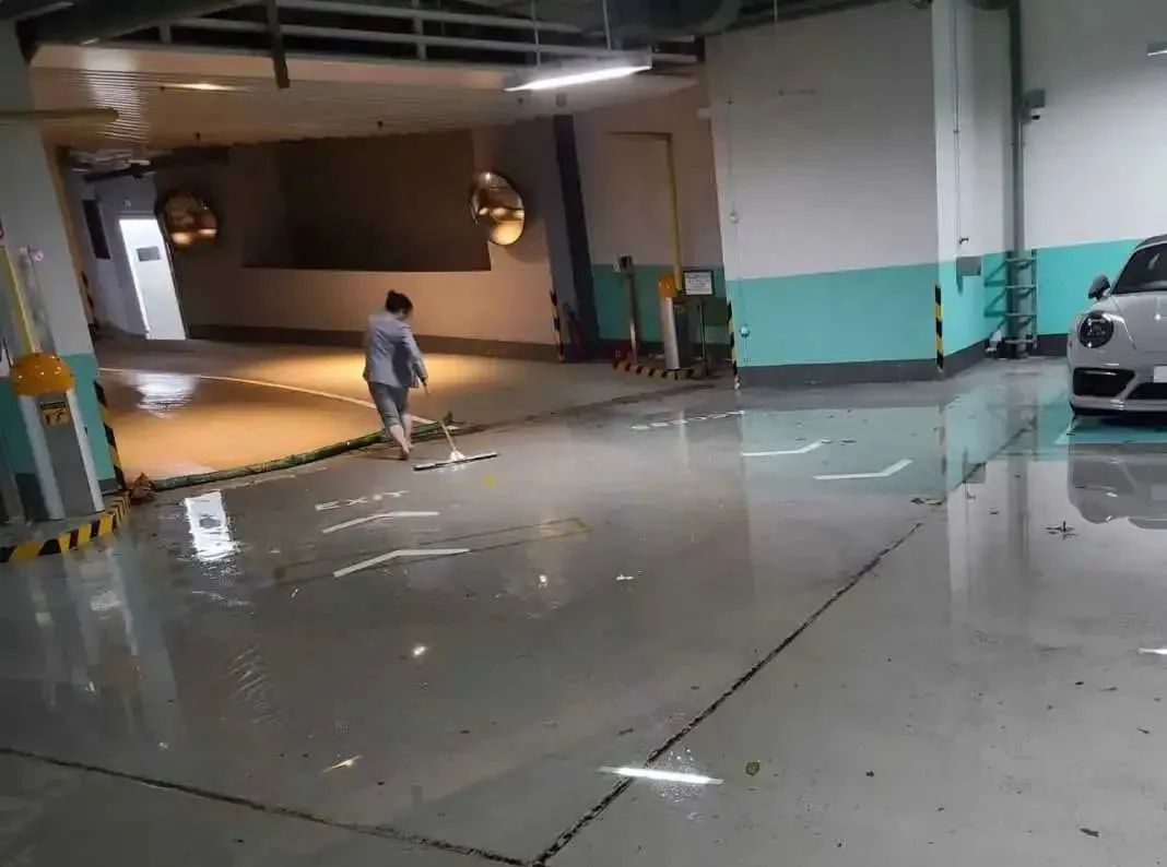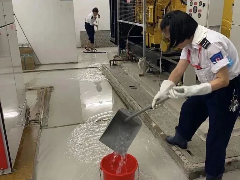 刻不容缓,就近项目的同事们现场支援中海·鹿丹名苑,大家来到地库进行排水防洪工作,地库水位得以快速下降。