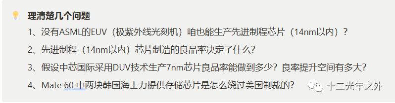 TechInsight对mate 60的拆机报告写的非常专业,这里面有大量的专业概念与技术参数,特别是非电子工程专业的小伙伴可能每个人读起来的理解都不一样,再加上译者翻译之后难免带上主观的烙印和受自己专业知识的影响,所以在这一章我将重点对我读这篇报告中涉及的一些概念和心中的几点问题进行探究后进行一次分享!