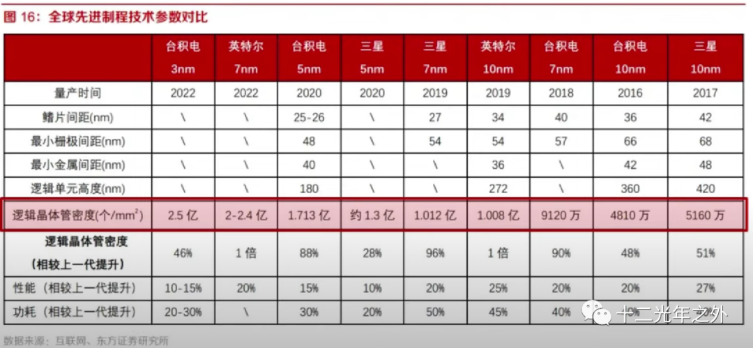 这篇来自网络的报告中,可以看出同样是号称7nm的技术,英特尔的7nm每平方nm可以承载 2~2.4亿个逻辑晶体管,而三星的是1.012亿个、台积电的只有9120万个。