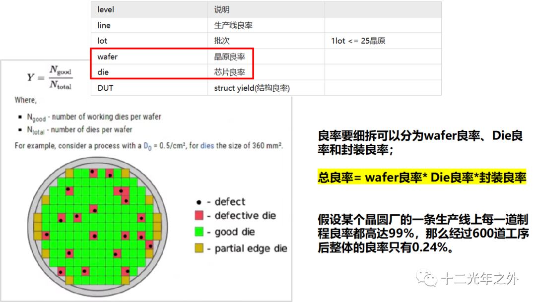 参考维基百科的介绍,芯片的良性有不同的测量方法,其中一般测wafer或者lot上的yield,其反映生产工艺中的控制问题, 如操作人员的误操作,设备故障等,通常也称为生产线良率(line yield)。例如,生产1000片wafer,最后由于各种原因报废 (scrap)20片wafer,那么line yield就等于98%。