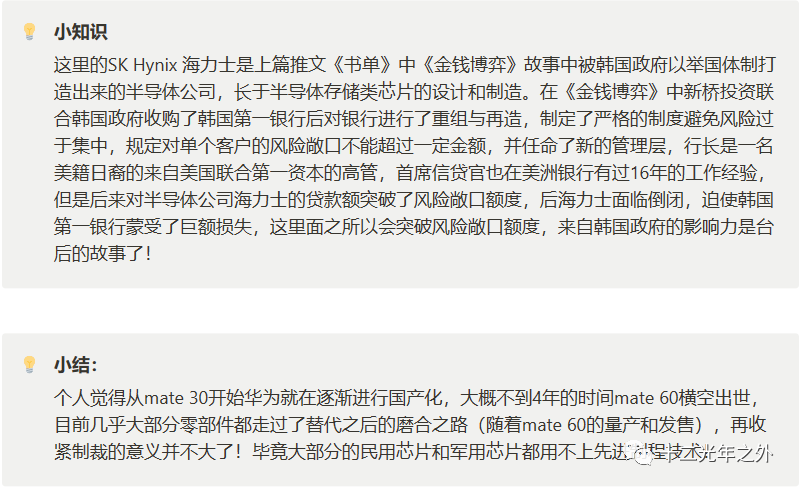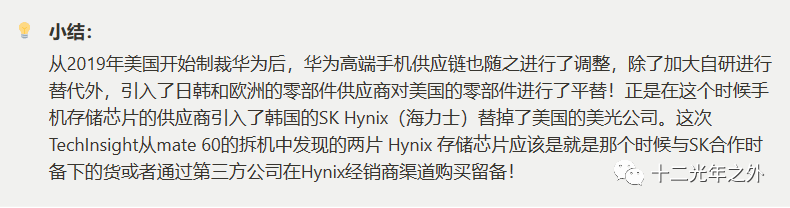 摘抄一些网络上的观点,大家就当个乐子看看吧。近期SK Hynix 发表的一份声明称,自美国对华为进行限制时,Hynix就不再与华为进行芯片上的合作。对于这次mate 60中有两款韩国芯片 512 GB NAND flash memory chip、12 gigabyte (GB) LPDDR5 chip,懂行的查一下这两种芯片的量产时间大概可以推断出是什么路子来的,来看看业内人士们怎么说