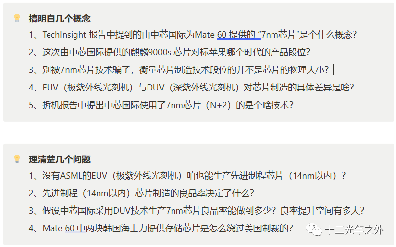 本期推文是笔者从9月4号开始跟踪TechInsight拆机后的一些思考上的分享。对于大部分非电子工程专业的朋友来说,跟着笔者一起搞明白TechInsight拆机报告中的几个关键概念和思考如下几个核心问题,相信会对后续在芯片产业领域研究更深层次的内容有所帮助!