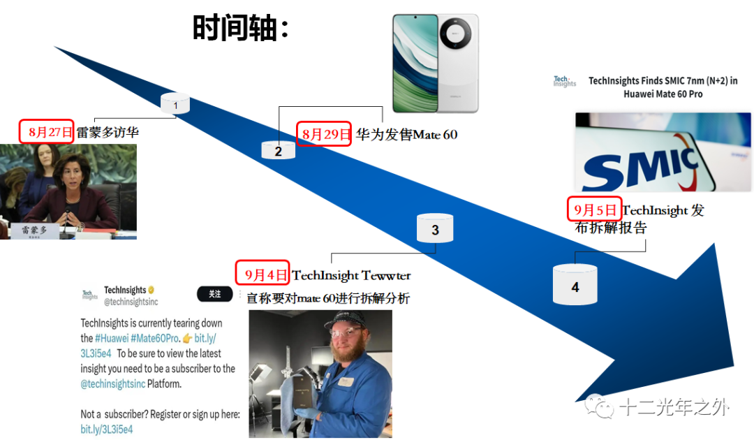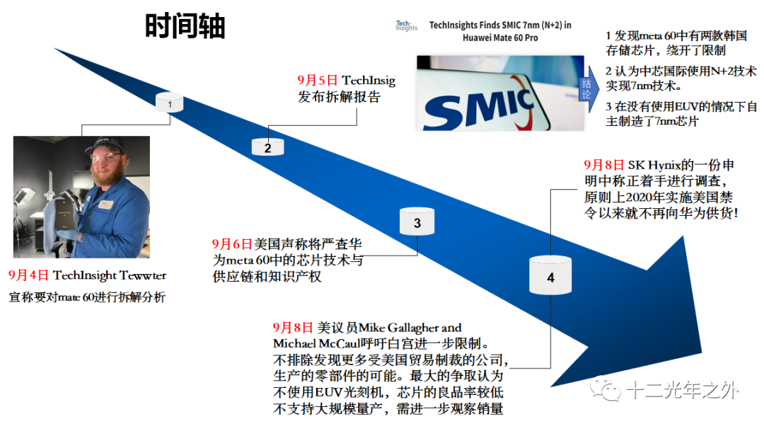 TechInsight 发布拆解mate 60的报告后,网络上的讨论尤为激烈,笔者把这段时间主要的事件以时间轴的形式做成了一张图,供读者们了解!