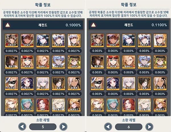 对此,游戏加入了抽卡等级——抽卡会提升卡池等级,等级越高稀有英雄出现几率越大。如等级5才开始有 0.1%机会抽到传奇英雄,等级6后上升到 0.11%。有效刺激玩家消费,以更快抽取卡池中稀有角色。