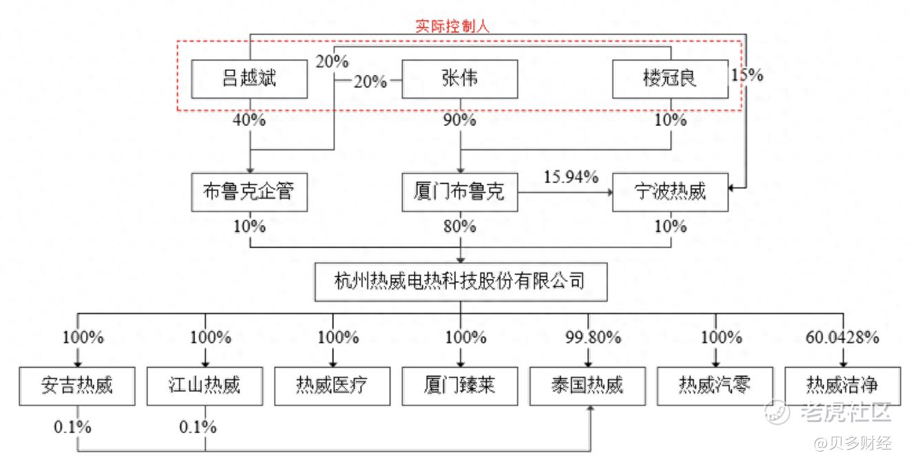 根据招股书介绍,张伟、楼冠良控制的厦门布鲁克持有热威电热80%的股份,厦门布鲁克控制的宁波热威持有热威电热10%的股份,吕越斌控制的布鲁克企管持有热威电热10%的股份。