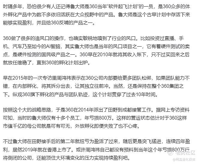 有人说今年是周鸿祎人生的十字路口,纷繁琐事接踵而来,说他压力山大可能都不足以形容,或许这个10年前的孵化计划还能带来一丝慰藉,舒缓一下心情。多事之秋还是需要一点好消息压压惊。 $三六零(601360)$ $鲁大师(03601)$