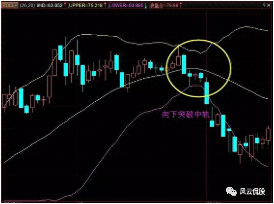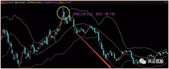 3、当K线从布林线的上方、向下突破布林线上轨后,如果布林线的上、中、下轨线的运动方向也开始同时向下,预示着股价的短期强势行情即将结束,股价的短期走势不容乐观,投资者应以逢高减磅为主。