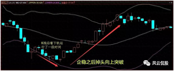 3、当K线在布林线下轨运行了一段时间后,如果K线的运动方向有掉头向上的迹象时,表明股价短期内将止跌企稳,投资者可以少量逢低建仓。