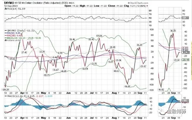 3. NYMO:NYSE McClellan Oscllator用纽NYSE的上涨家数和下跌家数来判断市场(1)计算(上涨家数-下跌家数)的19日和30日指数移动平均;(2)绘制(19日指数平均-39日移动平均)的计算结果