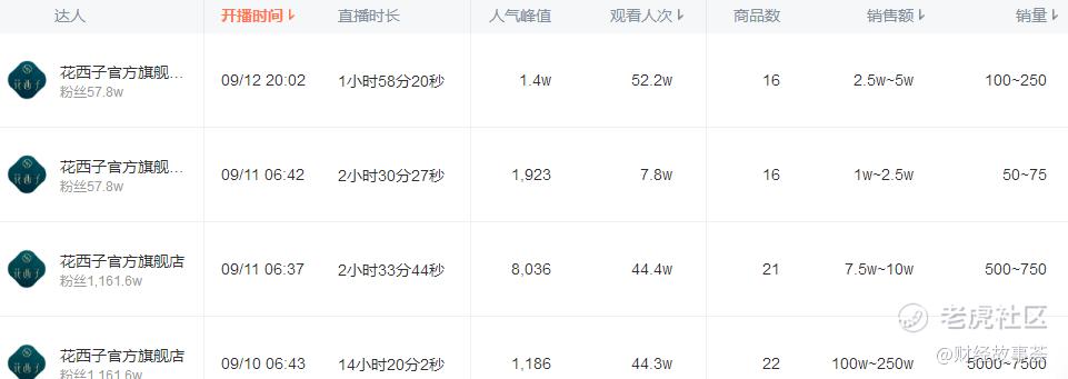 而据蝉妈妈估算,近几天,拥有1160多万粉丝的花西子抖音官方旗舰店的直播场观数没太大变化,仍维持在40-50万左右,但每天的GMV从9月10号的100-250万,降到9月11号的7.5-10万。