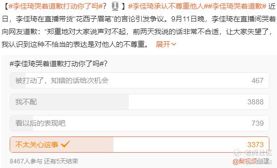 在微博一项“李佳琦哭着道歉打动你了吗?”的投票中,共有8467人参与,只有467人选择“被打动了,知错的话给次机会”,7200多人选择“我不配”或“不太关心这事”,还有739人表示“看以后的表现吧”——网友们不是那么容易哄好的。